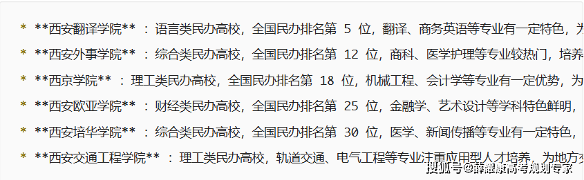 西安交通大学、西北工业大学、西北农林科技大学、西安电子科技大学、陕西师范大学、长安大学。这是陕西的几所985或211工程院校,实力摆正在那,因为陕西地处西北,所以分数线相对于沿海地域或经济强市要低一些,这也给大师报考陕西的院校供给了优良机遇,绝对是最佳选择。西安理工大学、西安邮电大学、西北大学、西安建建科技大学、陕西科技大学、西安科技大学、西安外国语大学。这些院校也都是老牌大学,实力雄厚、师资力量强大、硬件设备齐备,有浩繁的博士硕士授权点和国度特色专业及省级沉点学科,是你报考的抱负选择。西安石油大学、西安工业大学、西安财经大学、西安医学院、陕西西医药大学。这几所院校实力也相可不雅,师资力量强大,人才辈出,学校有双聘院士、出名学者、特级传授,有国度特色专业及省级沉点学科,是你肄业的优良选择。西安工程大学、延安大学、陕西理工大学、西安医学院、西安航空学院、西安美术学院、西安体育学院。这几所院校都是通俗本科院校,建校汗青长久、学风浓重,有浩繁的学位授权点和国度特色专业及省级沉点学科,正在此深制,你的将来不是梦。宝鸡文理学院、西安文理学院、榆林学院、咸阳师范学院、安康学院、渭南师范学院、商洛学院、陕前师范学院、西京学院、西安培华学院、西安交通大学城市学院、西安翻译学院、西安欧亚学院、西安思源学院、西安交通工程学院、西安科技大学高新学院、西安财经大学行知学院、陕西国际商贸学院、西安建建科技大学华清学院、延安大学西安立异学院、陕西服拆工程学院、西北工业大学北方消息工程学院、陕西科技大学镐京学院、西北工业大学明德学院、长安大学兴华学院、西安消息职业大学、西安外事学院、西北大学现代学院、西安理工大学高科学院。这些院校实力相对偏弱,但完全能够实现你读本科的胡想,只需你肯勤奋,考研就业都没有问题,你的将来会一片。西安交通大学:分析类名校,全国排名第 12 位,C9 联盟 / 双一流 / 985 高校,能源动力、机械工程等学科处于顶尖程度,为国度科研和人才培育做出了杰出贡献。西北工业大学:理工类名校,全国排名第 25 位,双一流 / 985 高校,航空宇航、材料科学等学科全国领先,是我国国防科技工业的主要人才培育。西安电子科技大学 :理工类高校,全国排名第 38 位,双一流 / 211 高校,消息取通信工程、计较机科学等学科实力强劲,正在电子消息范畴具有普遍影响力。西北农林科技大学:农林类高校,全国排名第 54 位,双一流 / 985 高校,农业科学、葡萄酒工程等学科特色明显,为我国农业和农村成长培育了大量专业人才。陕西师范大学:师范类高校,全国排名第 68 位,双一流 / 211 高校,教育学、中国言语文学等学科劣势较着,为处所根本教育输送了大量优良师资。长安大学:理工类高校,全国排名第 85 位,双一流 / 211 高校,交通运输工程、土木匠程等学科实力雄厚,为我邦交通范畴培育了大量专业人才。空军军医大学:医药类高校,全国排名第 90 位,211 高校,原第四军医大学,临床医学、口腔医学等学科处于顶尖程度,为我事医学和医疗卫生事业培育了大量专业人才。西北大学:分析类高校,全国排名第 64 位,具有双一流学科,考古学、地质学等学科正在全国名列前茅,为处所经济社会成长输送了大量复合型人才。西安建建科技大学:理工类高校,全国排名第 120 位,“建建老八校” 之一,土木匠程、城乡规划等学科特色明显,为建建行业培育了大量专业人才。西安理工大学:理工类高校,全国排名第 135 位,水利工程、印刷工程等学科劣势凸起,为处所制制业和工程手艺范畴输送了大量人才。陕西科技大学:理工类高校,全国排名第 150 位,轻工手艺取工程、皮革化学等学科有必然特色,为相关财产培育了大量专业手艺人才。西安邮电大学:理工类高校,全国排名第 180 位,消息取通信工程、收集平安等学科有必然劣势,为处所消息财产培育了大量人才。西安外国语大学:言语类高校,全国排名第 190 位,日语、俄语等学科正在全国排名靠前,为外事、经贸等范畴培育了大量外语人才。西安美术学院:艺术类高校,做为中国八大美院之一,美术学、设想学等学科实力强劲,为文化艺术财产培育了大量专业人才。西安音乐学院:艺术类高校,全国音乐类排名前五,正在音乐表演、做曲等范畴有必然影响力,为音乐艺术范畴培育了大量专业人才。西安石油大学:理工类高校,石油工程、地质资本等学科特色明显,为石油行业培育了大量专业手艺人才。西安工程大学:理工类高校,纺织工程、服拆设想等学科有必然劣势,为纺织服拆行业培育了大量专业人才。